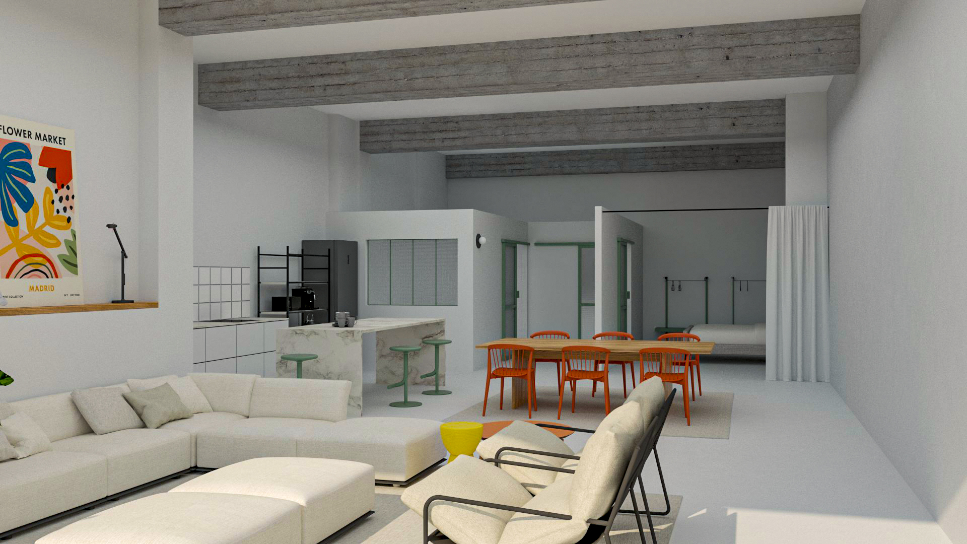 En la parte posterior se sitúan las áreas destinadas al descanso y usos más privados. Debido a la limitada disponibilidad de iluminación natural en esta zona, el dormitorio se delimita mediante una cortina en lugar de particiones rígidas. Esta solución flexible permite mantener la continuidad espacial y el paso de la luz y el aire, al tiempo que ofrece la posibilidad de privacidad y ocultación cuando es necesario. El resultado es una organización adaptable que optimiza las condiciones ambientales existentes sin renunciar al confort.